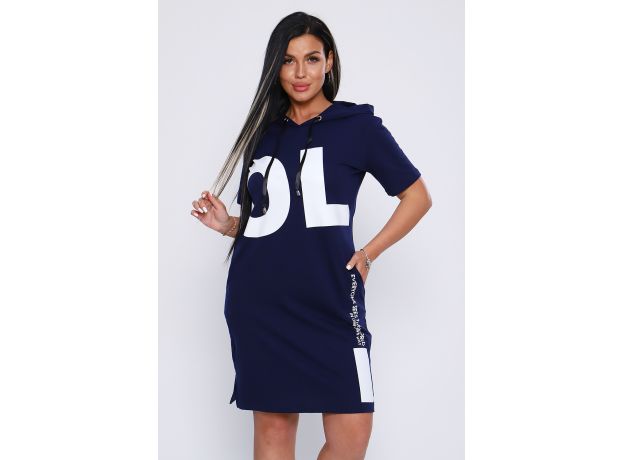 Женская туника из легкого трикотажного материала тонкого хлопка - кулирки. Свободная, спортивная, с капюшоном - её вполне можно использовать как летний вечерний костюм, как повседневный домашний наряд или как легкое праздничное или офисное платье. Благодаря свободному крою, туника отлично подойдет полным и пышным женщинам, беременным девушкам и кормящим мамам. Модный, нарядный черный принт в виде крупных и мелких латинских букв актуален всегда и придает изделию особый шик. Карманы спрятаны в боковых швах для вашего удобства.
