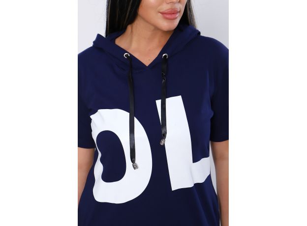 Женская туника из легкого трикотажного материала тонкого хлопка - кулирки. Свободная, спортивная, с капюшоном - её вполне можно использовать как летний вечерний костюм, как повседневный домашний наряд или как легкое праздничное или офисное платье. Благодаря свободному крою, туника отлично подойдет полным и пышным женщинам, беременным девушкам и кормящим мамам. Модный, нарядный черный принт в виде крупных и мелких латинских букв актуален всегда и придает изделию особый шик. Карманы спрятаны в боковых швах для вашего удобства.