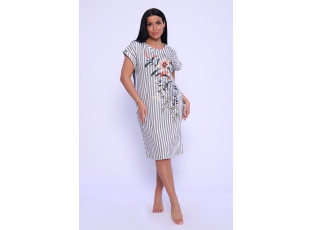 Легкая трикотажная туника из 100%-го хлопка на каждый день в очаровательную полоску. Легкий, свободный фасон подчеркнет вашу женственность и красоту, туника имеет удобный свободный крой, округлую горловину и чуть приспущенный короткий рукав. В боковых швах спрятаны два глубоких кармана, что добавляет ей дополнительный комфорт и практичность ведь так удобно всегда иметь под рукой телефон или другие мелочи. Идеальный свободный крой с расширением к низу прекрасно скрывает недостатки фигуры. Дизайн туники дополнен стильным принтом в виде гирлянды прекрасных цветов. Если вы хотите купить трикотажное изделие и ощущать в нем комфорт и свободу, то наша туника вам абсолютно подойдет!