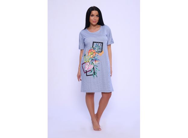 Туника свободного кроя с идеальной посадкой на любую фигуру. Скроет все недостатки и подчеркнет все самое красивое. Туника будет удобна в путешествиях и на отдыхе, а так же в качестве повседневной одежды или домашнего платья. Изготовлена из дышащей ткани, не деформируется после многочисленных стирок. Легкий дизайн туники дополнен изображением яркого цветочного букета, который эффектно сочетается с геометрическими фигурами. Дополнительно есть декор из ряда пуговиц, смещенных в сторону. Длина платья до колена отлично сочетается с коротким рукавом, дополненным аккуратными отворотами.
