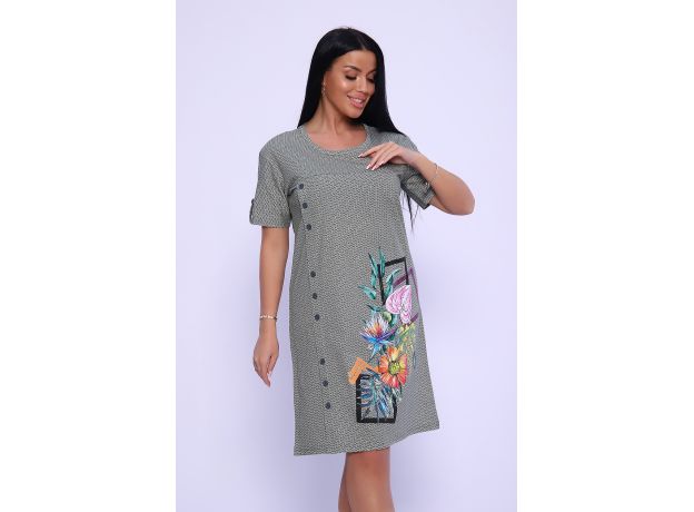 Туника свободного кроя с идеальной посадкой на любую фигуру. Скроет все недостатки и подчеркнет все самое красивое. Туника будет удобна в путешествиях и на отдыхе, а так же в качестве повседневной одежды или домашнего платья. Изготовлена из дышащей ткани, не деформируется после многочисленных стирок. Легкий дизайн туники дополнен изображением яркого цветочного букета, который эффектно сочетается с геометрическими фигурами. Дополнительно есть декор из ряда пуговиц, смещенных в сторону. Длина платья до колена отлично сочетается с коротким рукавом, дополненным аккуратными отворотами.