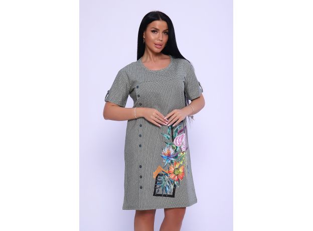 Туника свободного кроя с идеальной посадкой на любую фигуру. Скроет все недостатки и подчеркнет все самое красивое. Туника будет удобна в путешествиях и на отдыхе, а так же в качестве повседневной одежды или домашнего платья. Изготовлена из дышащей ткани, не деформируется после многочисленных стирок. Легкий дизайн туники дополнен изображением яркого цветочного букета, который эффектно сочетается с геометрическими фигурами. Дополнительно есть декор из ряда пуговиц, смещенных в сторону. Длина платья до колена отлично сочетается с коротким рукавом, дополненным аккуратными отворотами.