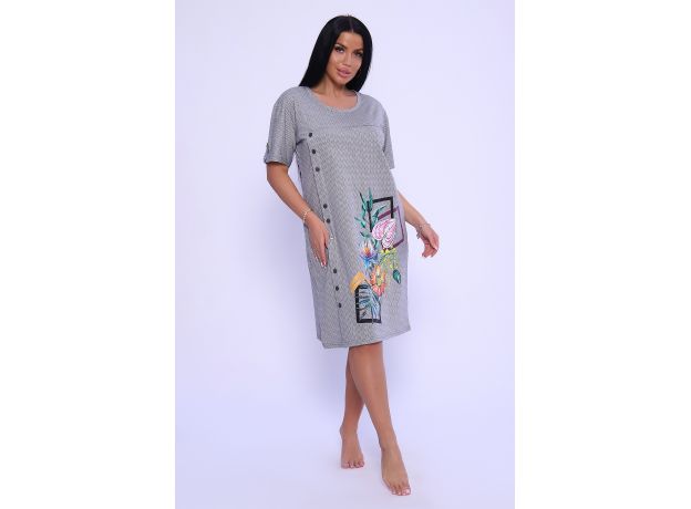 Туника свободного кроя с идеальной посадкой на любую фигуру. Скроет все недостатки и подчеркнет все самое красивое. Туника будет удобна в путешествиях и на отдыхе, а так же в качестве повседневной одежды или домашнего платья. Изготовлена из дышащей ткани, не деформируется после многочисленных стирок. Легкий дизайн туники дополнен изображением яркого цветочного букета, который эффектно сочетается с геометрическими фигурами. Дополнительно есть декор из ряда пуговиц, смещенных в сторону. Длина платья до колена отлично сочетается с коротким рукавом, дополненным аккуратными отворотами.