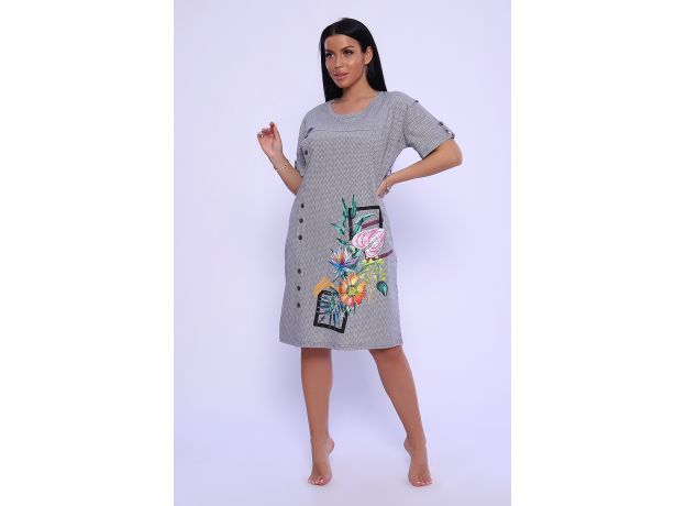 Туника свободного кроя с идеальной посадкой на любую фигуру. Скроет все недостатки и подчеркнет все самое красивое. Туника будет удобна в путешествиях и на отдыхе, а так же в качестве повседневной одежды или домашнего платья. Изготовлена из дышащей ткани, не деформируется после многочисленных стирок. Легкий дизайн туники дополнен изображением яркого цветочного букета, который эффектно сочетается с геометрическими фигурами. Дополнительно есть декор из ряда пуговиц, смещенных в сторону. Длина платья до колена отлично сочетается с коротким рукавом, дополненным аккуратными отворотами.