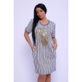 Женская туника из хлопковой ткани (кулирка, хлопок 100%), свободного кроя, который подчеркнет вашу женственность и красоту. Материал не только комфортен в использовании, но и практичен, т.к. устойчив к износу. Для вашего удобства мы спрятали в боковых швах карманы, в которых незаметно для вас разместятся различные необходимые мелочи. Дизайн туники дополнен эффектным принтом, в виде ярко сияющего пера жар-птицы, расположенного на полочке. Модель несомненно станет украшением вашего гардероба. Туника имеет широкий размерный ряд, поэтому подойдет как миниатюрным девушкам, так и обладательницам более крупных размеров. Если вы хотите ощущать комфорт и свободу, то эта туника именно то, что вы ищете!