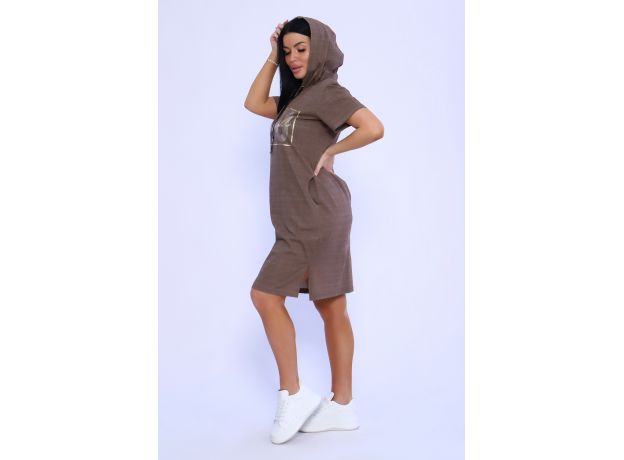 Женская туника из легкого трикотажного материала тонкого хлопка - кулирки. Свободная, спортивная, с капюшоном, объем которого регулируется атласной лентой контрастного цвета. Тунику вполне можно использовать как летний вечерний костюм, как повседневный домашний наряд или как легкое праздничное или офисное платье. Благодаря свободному крою, туника отлично подойдет полным и пышным женщинам, беременным девушкам и кормящим мамам. Нарядный принт в виде мерцающих крупных и мелких латинских букв актуален всегда и придает изделию особый шик. Карманы спрятаны в боковых швах для вашего удобства.