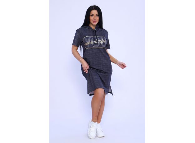 Женская туника из легкого трикотажного материала тонкого хлопка - кулирки. Свободная, спортивная, с капюшоном, объем которого регулируется атласной лентой контрастного цвета. Тунику вполне можно использовать как летний вечерний костюм, как повседневный домашний наряд или как легкое праздничное или офисное платье. Благодаря свободному крою, туника отлично подойдет полным и пышным женщинам, беременным девушкам и кормящим мамам. Нарядный принт в виде мерцающих крупных и мелких латинских букв актуален всегда и придает изделию особый шик. Карманы спрятаны в боковых швах для вашего удобства.