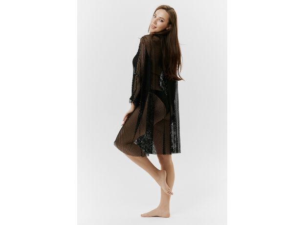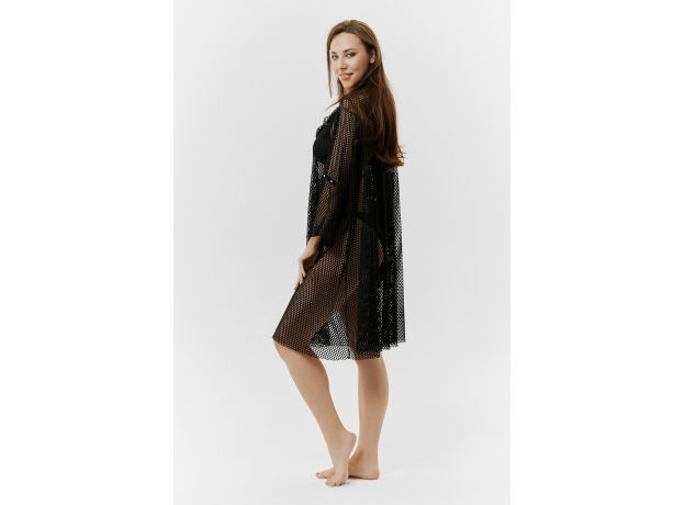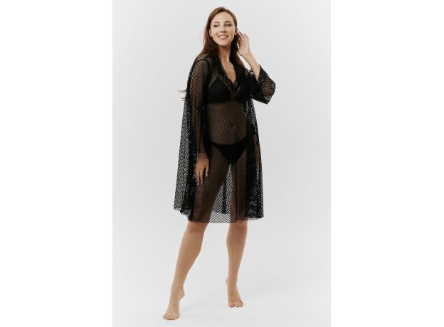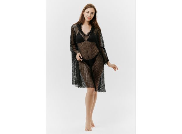 Туника женская пляжная, свободного силуэта с капюшоном и длинным рукавом. Декорирована хольнитенами.