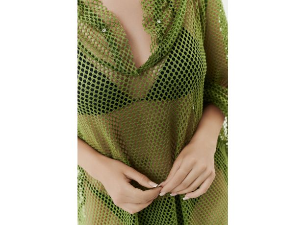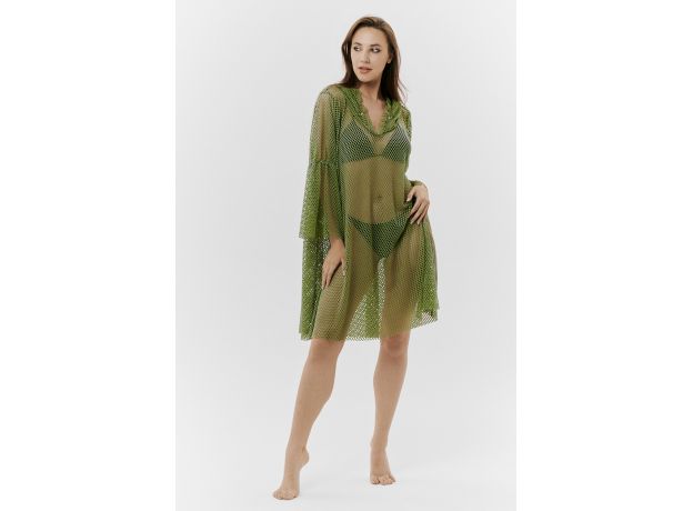 Туника женская пляжная, свободного силуэта с капюшоном и длинным рукавом. Декорирована хольнитенами.
