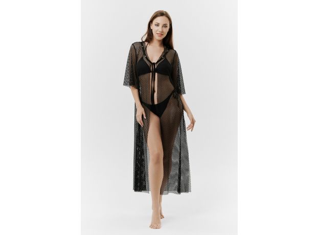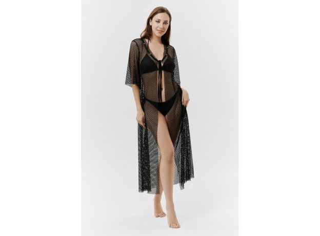 Туника пляжная, длинная, свободного силуэта, на груди завязывается, горловина оформлена декоративными стразами.