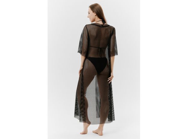Туника пляжная, длинная, свободного силуэта, на груди завязывается, горловина оформлена декоративными стразами.