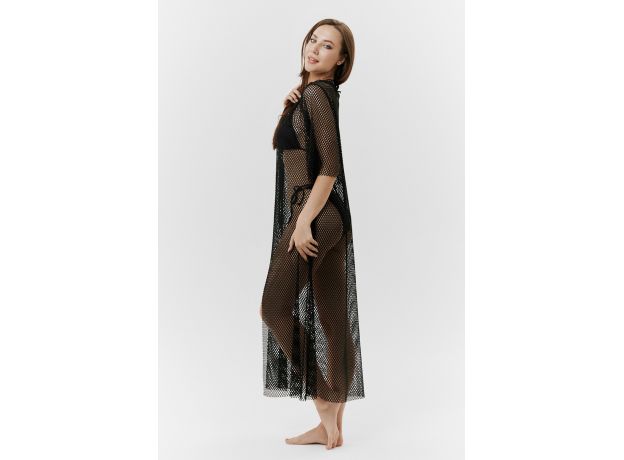 Туника пляжная, длинная, свободного силуэта, на груди завязывается, горловина оформлена декоративными стразами.