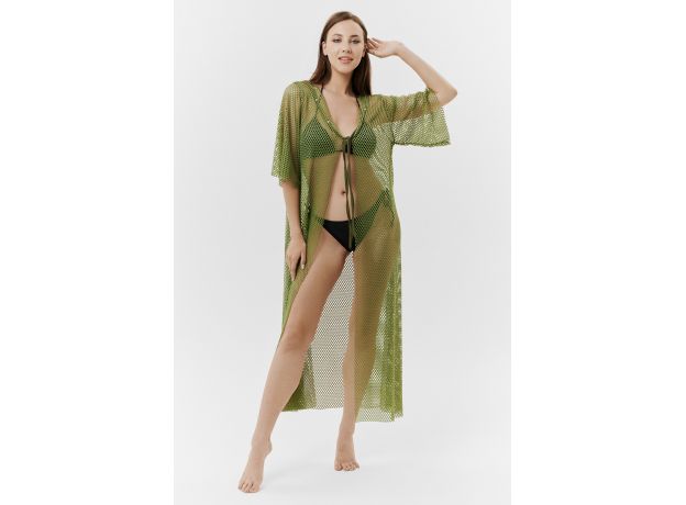 Туника пляжная, длинная, свободного силуэта, на груди завязывается, горловина оформлена декоративными стразами.