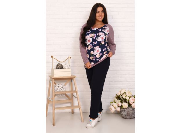 Туника женская, полочка и спинка из набивного футера двухнитки. Рукав реглан однотонный из интерлока качества пенье. Для дома и отдыха.