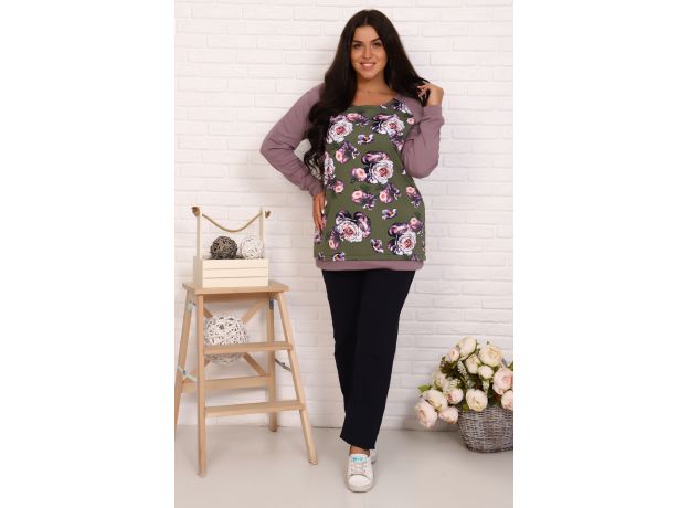 Туника женская, полочка и спинка из набивного футера двухнитки. Рукав реглан однотонный из интерлока качества пенье. Для дома и отдыха.