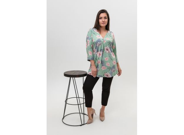 Туника женская со спущенным цельнокроеным рукавом длиной 3/4 выполнена из вискозы красивой, нежной расцветки. Горловина туники имеет V-образный вырез, обработана планкой, низ изделия немного расклешен. Ткань хорошего качества, при стирке не линяет, не дает усадку, сохраняет форму.
