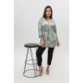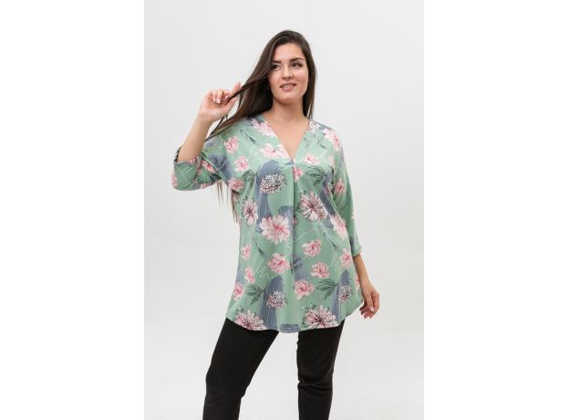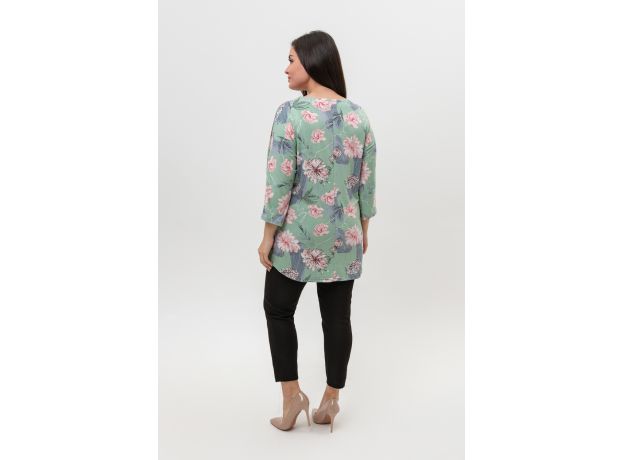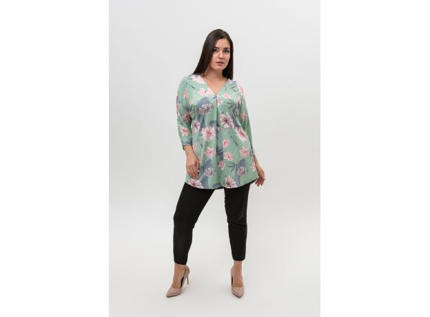 Туника женская со спущенным цельнокроеным рукавом длиной 3/4 выполнена из вискозы красивой, нежной расцветки. Горловина туники имеет V-образный вырез, обработана планкой, низ изделия немного расклешен. Ткань хорошего качества, при стирке не линяет, не дает усадку, сохраняет форму.