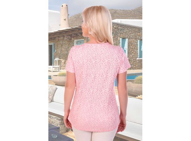 Туника с коротким рукавом, кружевной кокеткой и декоративным элементом в разрезе горловины. Длина до бедер.