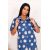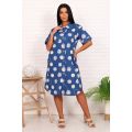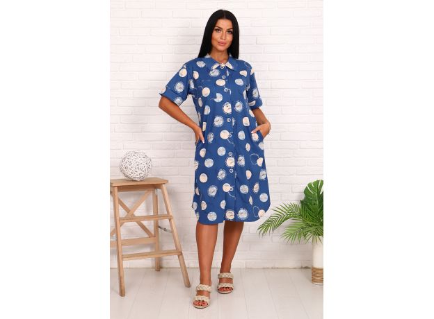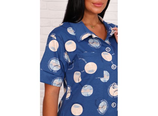 Туника-рубашка женская повседневная свободного силуэта из набивного трикотажного полотна (кулирка, 100% хлопок), длиной чуть ниже колена. Горловина круглая с отложным воротником. На полочке рубашки расположен накладной нагрудный карман. Плечо спущенное. Рукава короткие, низ рукавов на манжете. В боковых швах расположены карманы. Спинка цельнокроенная. Низ туники фигурный. Туника-рубашка застегивается на пуговицы.
