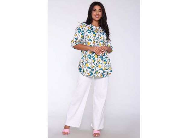 Туника женская Туника-рубашка имеет округлый вырез с фигурной капелькой. Рукава 3/4 и низ подогнуты на плоскошовной машине, а так жен имеют декоративный элемент с пуговицей.Блуза женская подходит для беременных, для полных, для женщин больших размеров. Туника-рубашка подойдет для лета, весны, осени, зимы