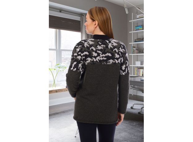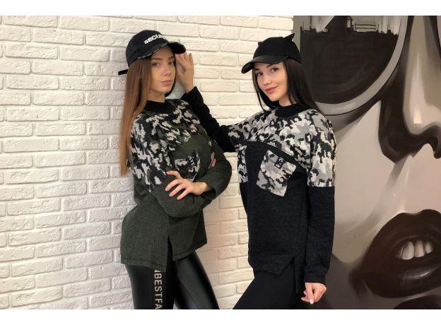 Туника женская прямого силуэта. Рукав цельнокроенный со швом. Полочка короче спинки. Воротник-стойка из кашкорсе. На полочке два нагрудных накладных кармана, по боковому шву разрезы, слегка перенесенные в сторону полочки. Туника из однотонной ткани Пике, кокетки полочки и спинки, карманы из ткани Жакке с модным принтом камуфляж.