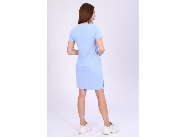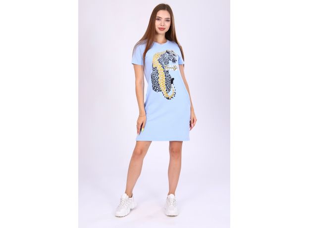 Женское платье-туника длиной чуть выше колена с коротким втачным рукавом, боковыми карманами в шве и небольшими разрезами по бокам внизу. Спереди на полочке расположен принт с глиттером в виде леопарда с надписью WILD beauty. Округлая горловина обработана обтачкой из основного материала с декоративной отсрочкой по линии втачиваемого воротника. Низ рукавов и низ туники обработан подгибкой. Выполнена из однотонного высококачественного трикотажного полотна - кулирки с лайкрой пенье. Стойкие цвета ткани, яркий принт. Для дома, для дачи, на прогулку, для отдыха, в отпуск, на море. Отличный подарок девушкам к любому поводу!