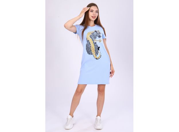 Женское платье-туника длиной чуть выше колена с коротким втачным рукавом, боковыми карманами в шве и небольшими разрезами по бокам внизу. Спереди на полочке расположен принт с глиттером в виде леопарда с надписью WILD beauty. Округлая горловина обработана обтачкой из основного материала с декоративной отсрочкой по линии втачиваемого воротника. Низ рукавов и низ туники обработан подгибкой. Выполнена из однотонного высококачественного трикотажного полотна - кулирки с лайкрой пенье. Стойкие цвета ткани, яркий принт. Для дома, для дачи, на прогулку, для отдыха, в отпуск, на море. Отличный подарок девушкам к любому поводу!