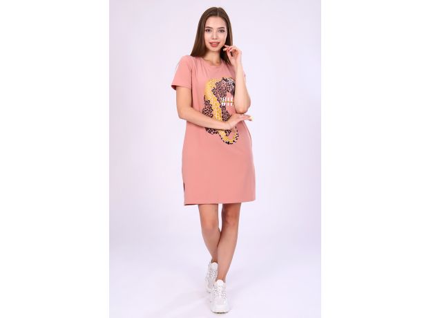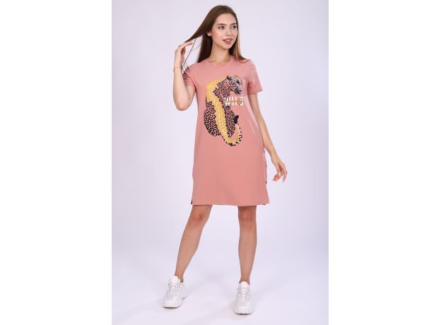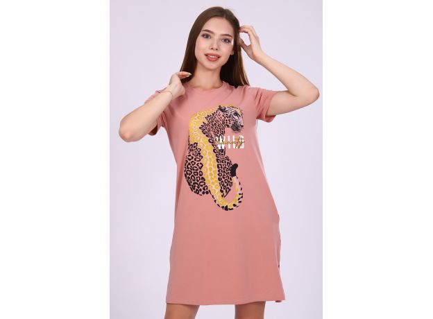 Женское платье-туника длиной чуть выше колена с коротким втачным рукавом, боковыми карманами в шве и небольшими разрезами по бокам внизу. Спереди на полочке расположен принт с глиттером в виде леопарда с надписью WILD beauty. Округлая горловина обработана обтачкой из основного материала с декоративной отсрочкой по линии втачиваемого воротника. Низ рукавов и низ туники обработан подгибкой. Выполнена из однотонного высококачественного трикотажного полотна - кулирки с лайкрой пенье. Стойкие цвета ткани, яркий принт. Для дома, для дачи, на прогулку, для отдыха, в отпуск, на море. Отличный подарок девушкам к любому поводу!