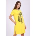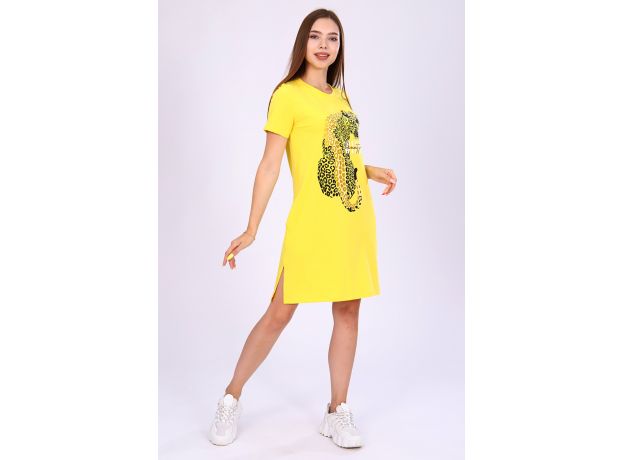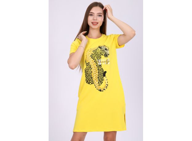 Женское платье-туника длиной чуть выше колена с коротким втачным рукавом, боковыми карманами в шве и небольшими разрезами по бокам внизу. Спереди на полочке расположен принт с глиттером в виде леопарда с надписью WILD beauty. Округлая горловина обработана обтачкой из основного материала с декоративной отсрочкой по линии втачиваемого воротника. Низ рукавов и низ туники обработан подгибкой. Выполнена из однотонного высококачественного трикотажного полотна - кулирки с лайкрой пенье. Стойкие цвета ткани, яркий принт. Для дома, для дачи, на прогулку, для отдыха, в отпуск, на море. Отличный подарок девушкам к любому поводу!