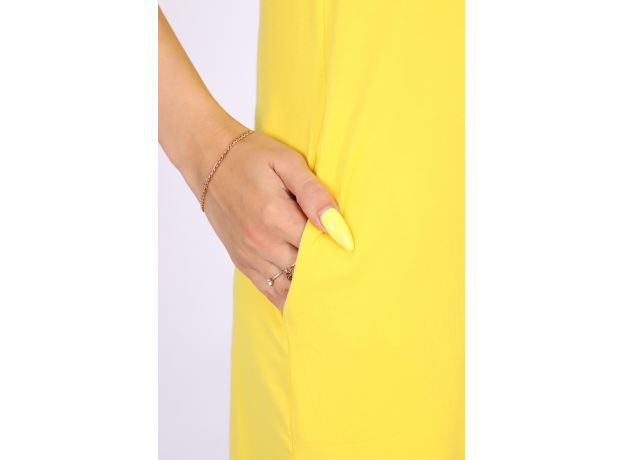 Женское платье-туника длиной чуть выше колена с коротким втачным рукавом, боковыми карманами в шве и небольшими разрезами по бокам внизу.