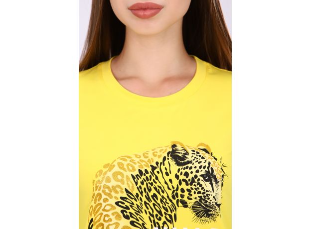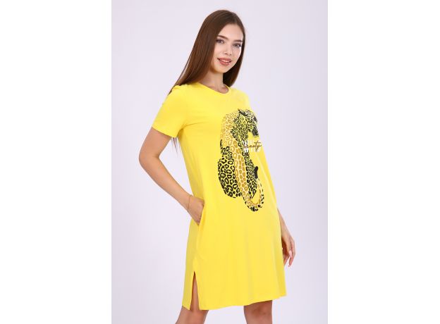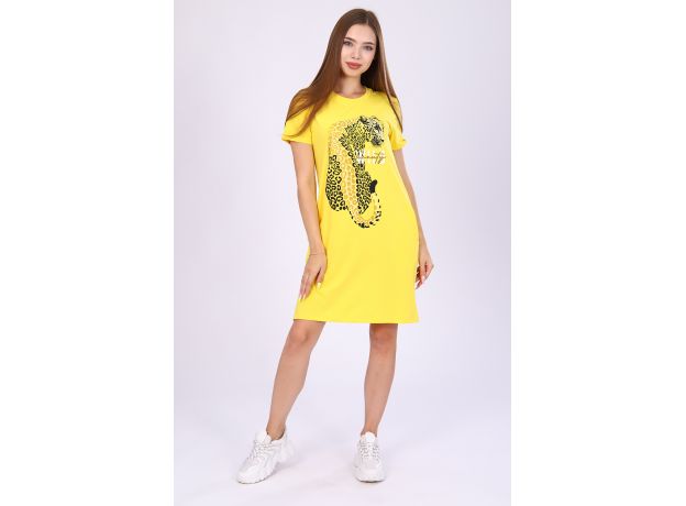 Женское платье-туника длиной чуть выше колена с коротким втачным рукавом, боковыми карманами в шве и небольшими разрезами по бокам внизу. Спереди на полочке расположен принт с глиттером в виде леопарда с надписью WILD beauty. Округлая горловина обработана обтачкой из основного материала с декоративной отсрочкой по линии втачиваемого воротника. Низ рукавов и низ туники обработан подгибкой. Выполнена из однотонного высококачественного трикотажного полотна - кулирки с лайкрой пенье. Стойкие цвета ткани, яркий принт. Для дома, для дачи, на прогулку, для отдыха, в отпуск, на море. Отличный подарок девушкам к любому поводу!
