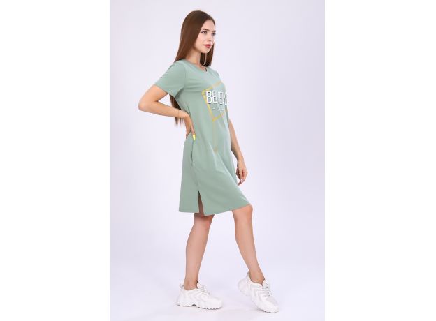 Женское платье-туника длиной чуть выше колена с коротким втачным рукавом, боковыми карманами в шве и небольшими разрезами по бокам внизу. Спереди на полочке расположен принт в виде цепочек с надписью Believe in Yourself (Верь в себя). Округлая горловина обработана обтачкой из основного материала с декоративной отсрочкой по линии втачиваемого воротника. Низ рукавов и низ туники обработан подгибкой. Выполнена из однотонного высококачественного трикотажного полотна - кулирки с лайкрой пенье. Стойкие цвета ткани, яркий принт. Для дома, для дачи, на прогулку, для отдыха, в отпуск, на море. Отличный подарок девушкам к любому поводу!