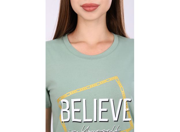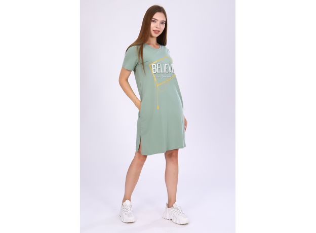 Женское платье-туника длиной чуть выше колена с коротким втачным рукавом, боковыми карманами в шве и небольшими разрезами по бокам внизу. Спереди на полочке расположен принт в виде цепочек с надписью Believe in Yourself (Верь в себя). Округлая горловина обработана обтачкой из основного материала с декоративной отсрочкой по линии втачиваемого воротника. Низ рукавов и низ туники обработан подгибкой. Выполнена из однотонного высококачественного трикотажного полотна - кулирки с лайкрой пенье. Стойкие цвета ткани, яркий принт. Для дома, для дачи, на прогулку, для отдыха, в отпуск, на море. Отличный подарок девушкам к любому поводу!