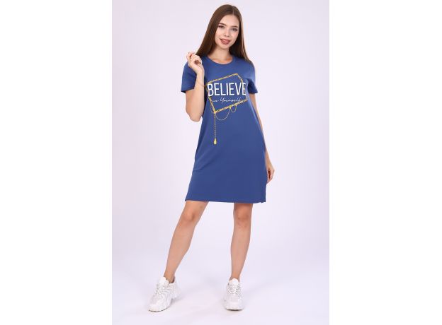 Женское платье-туника длиной чуть выше колена с коротким втачным рукавом, боковыми карманами в шве и небольшими разрезами по бокам внизу. Спереди на полочке расположен принт в виде цепочек с надписью Believe in Yourself (Верь в себя). Округлая горловина обработана обтачкой из основного материала с декоративной отсрочкой по линии втачиваемого воротника. Низ рукавов и низ туники обработан подгибкой. Выполнена из однотонного высококачественного трикотажного полотна - кулирки с лайкрой пенье. Стойкие цвета ткани, яркий принт. Для дома, для дачи, на прогулку, для отдыха, в отпуск, на море. Отличный подарок девушкам к любому поводу!