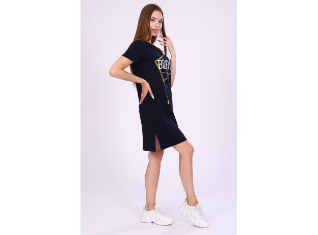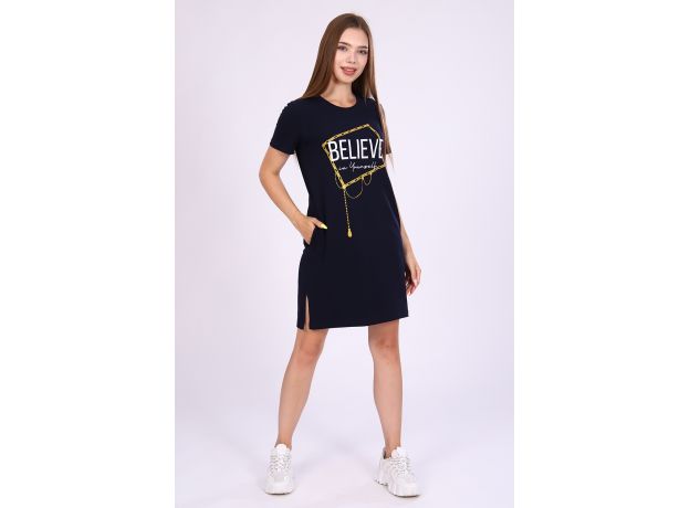 Женское платье-туника длиной чуть выше колена с коротким втачным рукавом, боковыми карманами в шве и небольшими разрезами по бокам внизу. Спереди на полочке расположен принт в виде цепочек с надписью Believe in Yourself (Верь в себя). Округлая горловина обработана обтачкой из основного материала с декоративной отсрочкой по линии втачиваемого воротника. Низ рукавов и низ туники обработан подгибкой. Выполнена из однотонного высококачественного трикотажного полотна - кулирки с лайкрой пенье. Стойкие цвета ткани, яркий принт. Для дома, для дачи, на прогулку, для отдыха, в отпуск, на море. Отличный подарок девушкам к любому поводу!