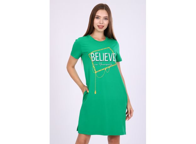 Женское платье-туника длиной чуть выше колена с коротким втачным рукавом, боковыми карманами в шве и небольшими разрезами по бокам внизу. Спереди на полочке расположен принт в виде цепочек с надписью Believe in Yourself (Верь в себя). Округлая горловина обработана обтачкой из основного материала с декоративной отсрочкой по линии втачиваемого воротника. Низ рукавов и низ туники обработан подгибкой. Выполнена из однотонного высококачественного трикотажного полотна - кулирки с лайкрой пенье. Стойкие цвета ткани, яркий принт. Для дома, для дачи, на прогулку, для отдыха, в отпуск, на море. Отличный подарок девушкам к любому поводу!