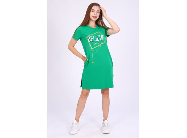 Женское платье-туника длиной чуть выше колена с коротким втачным рукавом, боковыми карманами в шве и небольшими разрезами по бокам внизу. Спереди на полочке расположен принт в виде цепочек с надписью Believe in Yourself (Верь в себя). Округлая горловина обработана обтачкой из основного материала с декоративной отсрочкой по линии втачиваемого воротника. Низ рукавов и низ туники обработан подгибкой. Выполнена из однотонного высококачественного трикотажного полотна - кулирки с лайкрой пенье. Стойкие цвета ткани, яркий принт. Для дома, для дачи, на прогулку, для отдыха, в отпуск, на море. Отличный подарок девушкам к любому поводу!