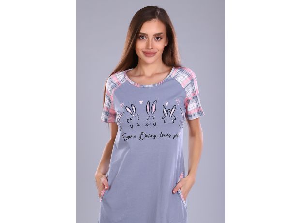 Женское платье-туника длиной чуть выше колена с милым принтом на полочке в виде зайчиков и надписи Some Bunny loves you, короткими рукавами-реглан контрастного цвета с принтов по ткани в виде клетки и округлой горловиной. Низ платья закруглен и образует небольшие разрезы по бокам. Горловина и вход в карманы обработаны окантовкой из ткани бридж. Наличие боковых карманов добавит дополнительный комфорт при использовании. Выполнена из трикотажного полотна высокого качества, 100% хлопок. Удобная, модная приятная к телу. Не стесняет движения. Нежные, пастельные цвета соответствуют модным тенденциям. Можно носить, как домашнюю тунику, ночнушку или уличное платье. Для дома и отдыха, для дачи. Принт в виде символа 2023 года делает эту модель актуальным подарком к Новому Году. Отличный подарок для девочек, юных девушек и женщин по любому поводу!