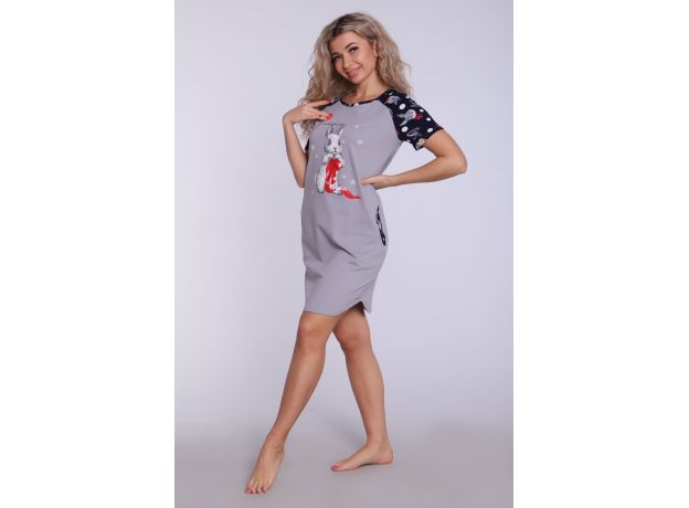 Женское платье-туника длиной чуть выше колена с милым принтом на полочке в виде животного-символа Нового 2023 года - зайчика, с короткими рукавами - реглан контрастного цвета и округлой горловиной. Низ платья закруглен и образует небольшие разрезы по бокам. Горловина и вход в карманы обработаны окантовкой из ткани рукавов. Наличие боковых карманов добавит дополнительный комфорт при использовании. Выполнена из трикотажного полотна, 100% хлопок. Удобная, модная приятная к телу. Не стесняет движения. Яркие стойкие цвета соответствуют модным тенденциям. Можно носить, как домашнюю тунику или уличное платье. Для дома и отдыха, для дачи. Новогодняя тематика принтов делает эту модель отличным подарком девушкам на Новый год!