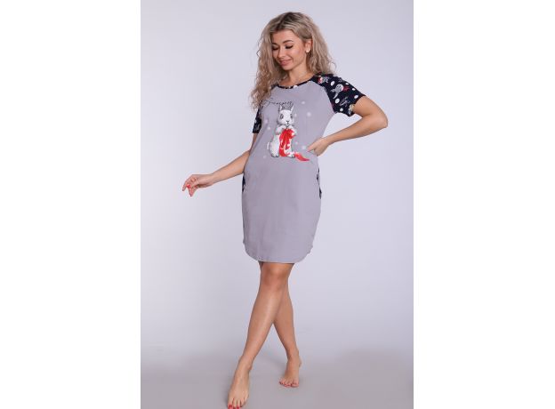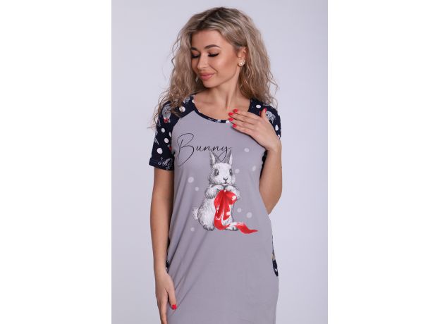Женское платье-туника длиной чуть выше колена с милым принтом на полочке в виде животного-символа Нового 2023 года - зайчика, с короткими рукавами - реглан контрастного цвета и округлой горловиной. Низ платья закруглен и образует небольшие разрезы по бокам. Горловина и вход в карманы обработаны окантовкой из ткани рукавов. Наличие боковых карманов добавит дополнительный комфорт при использовании. Выполнена из трикотажного полотна, 100% хлопок. Удобная, модная приятная к телу. Не стесняет движения. Яркие стойкие цвета соответствуют модным тенденциям. Можно носить, как домашнюю тунику или уличное платье. Для дома и отдыха, для дачи. Новогодняя тематика принтов делает эту модель отличным подарком девушкам на Новый год!