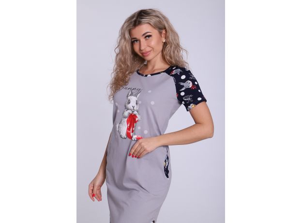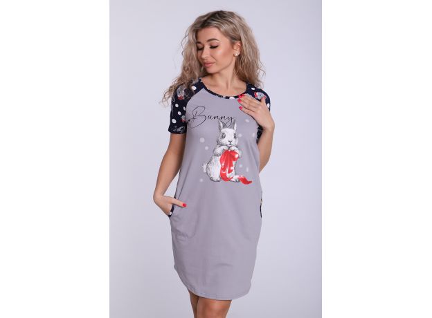 Женское платье-туника длиной чуть выше колена с милым принтом на полочке в виде животного-символа Нового 2023 года - зайчика, с короткими рукавами - реглан контрастного цвета и округлой горловиной. Низ платья закруглен и образует небольшие разрезы по бокам. Горловина и вход в карманы обработаны окантовкой из ткани рукавов. Наличие боковых карманов добавит дополнительный комфорт при использовании. Выполнена из трикотажного полотна, 100% хлопок. Удобная, модная приятная к телу. Не стесняет движения. Яркие стойкие цвета соответствуют модным тенденциям. Можно носить, как домашнюю тунику или уличное платье. Для дома и отдыха, для дачи. Новогодняя тематика принтов делает эту модель отличным подарком девушкам на Новый год!