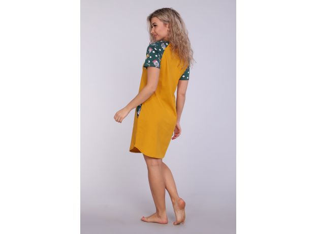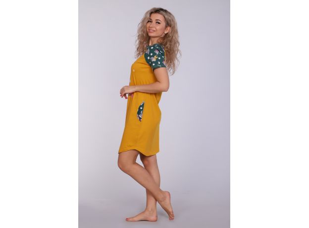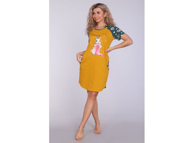 Женское платье-туника длиной чуть выше колена с милым принтом на полочке в виде животного-символа Нового 2023 года - зайчика, с короткими рукавами - реглан контрастного цвета и округлой горловиной. Низ платья закруглен и образует небольшие разрезы по бокам. Горловина и вход в карманы обработаны окантовкой из ткани рукавов. Наличие боковых карманов добавит дополнительный комфорт при использовании. Выполнена из трикотажного полотна, 100% хлопок. Удобная, модная приятная к телу. Не стесняет движения. Яркие стойкие цвета соответствуют модным тенденциям. Можно носить, как домашнюю тунику или уличное платье. Для дома и отдыха, для дачи. Новогодняя тематика принтов делает эту модель отличным подарком девушкам на Новый год!