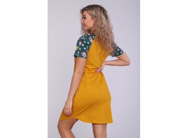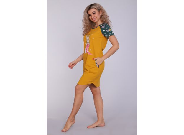 Женское платье-туника длиной чуть выше колена с милым принтом на полочке в виде животного-символа Нового 2023 года - зайчика, с короткими рукавами - реглан контрастного цвета и округлой горловиной. Низ платья закруглен и образует небольшие разрезы по бокам. Горловина и вход в карманы обработаны окантовкой из ткани рукавов. Наличие боковых карманов добавит дополнительный комфорт при использовании. Выполнена из трикотажного полотна, 100% хлопок. Удобная, модная приятная к телу. Не стесняет движения. Яркие стойкие цвета соответствуют модным тенденциям. Можно носить, как домашнюю тунику или уличное платье. Для дома и отдыха, для дачи. Новогодняя тематика принтов делает эту модель отличным подарком девушкам на Новый год!