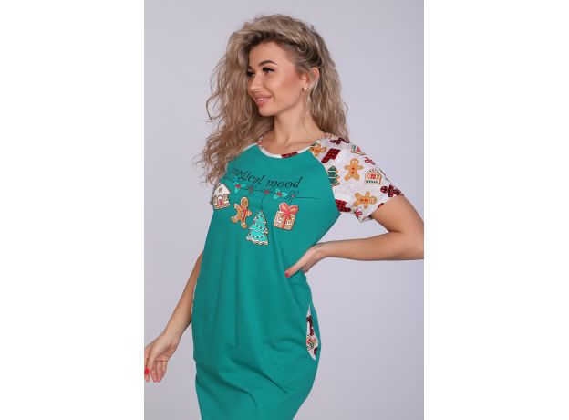Женское платье-туника длиной чуть выше колена с милым принтом на полочке в виде атрибутов новогодних праздников, короткими рукавами-реглан контрастного цвета и округлой горловиной. Низ платья закруглен и образует небольшие разрезы по бокам. Горловина и вход в карманы обработаны окантовкой из ткани рукавов. Наличие боковых карманов добавит дополнительный комфорт при использовании. Выполнена из трикотажного полотна, 100% хлопок. Удобная, модная приятная к телу. Не стесняет движения. Яркие стойкие цвета соответствуют модным тенденциям. Можно носить, как домашнюю тунику или уличное платье. Для дома и отдыха, для дачи. Новогодняя тематика принтов делает эту модель отличным подарком девушкам на Новый год!