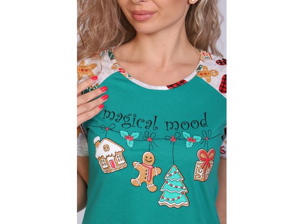 Женское платье-туника длиной чуть выше колена с милым принтом на полочке в виде атрибутов новогодних праздников, короткими рукавами-реглан контрастного цвета и округлой горловиной. Низ платья закруглен и образует небольшие разрезы по бокам. Горловина и вход в карманы обработаны окантовкой из ткани рукавов. Наличие боковых карманов добавит дополнительный комфорт при использовании. Выполнена из трикотажного полотна, 100% хлопок. Удобная, модная приятная к телу. Не стесняет движения. Яркие стойкие цвета соответствуют модным тенденциям. Можно носить, как домашнюю тунику или уличное платье. Для дома и отдыха, для дачи. Новогодняя тематика принтов делает эту модель отличным подарком девушкам на Новый год!