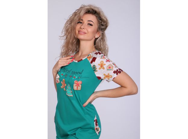 Женское платье-туника длиной чуть выше колена с милым принтом на полочке в виде атрибутов новогодних праздников, короткими рукавами-реглан контрастного цвета и округлой горловиной. Низ платья закруглен и образует небольшие разрезы по бокам. Горловина и вход в карманы обработаны окантовкой из ткани рукавов. Наличие боковых карманов добавит дополнительный комфорт при использовании. Выполнена из трикотажного полотна, 100% хлопок. Удобная, модная приятная к телу. Не стесняет движения. Яркие стойкие цвета соответствуют модным тенденциям. Можно носить, как домашнюю тунику или уличное платье. Для дома и отдыха, для дачи. Новогодняя тематика принтов делает эту модель отличным подарком девушкам на Новый год!