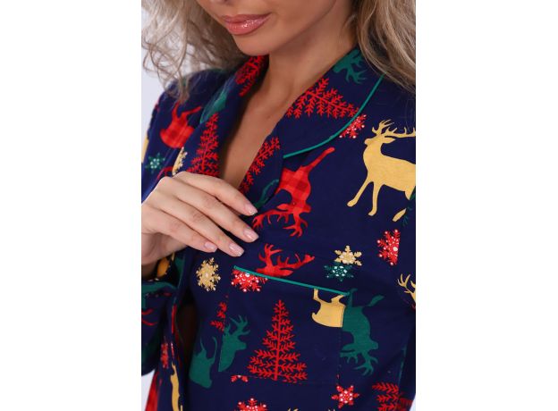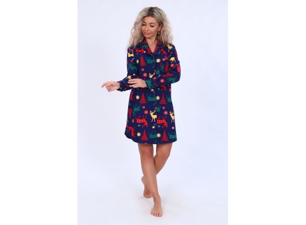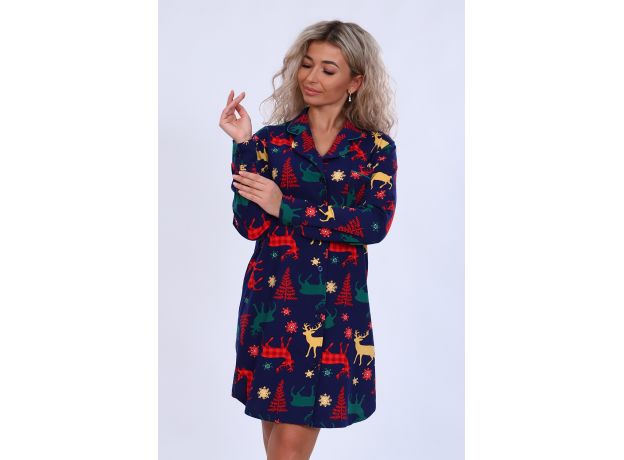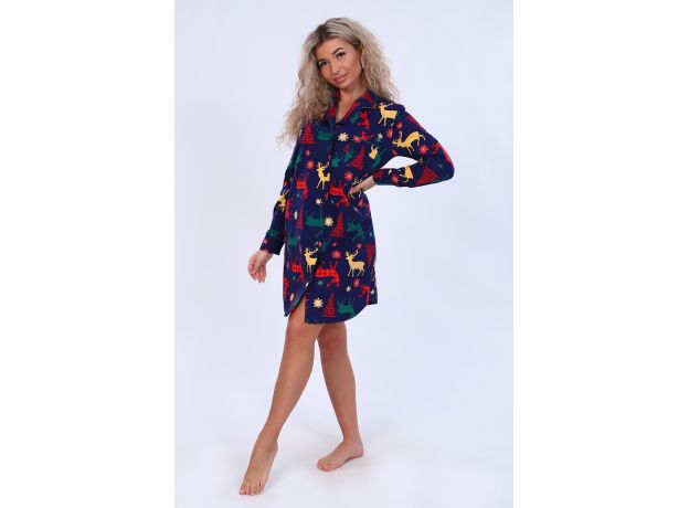 Женское платье-рубашка на пуговицах чуть выше колена с длинным рукавом на манжете. Разрез рукава окантован. На груди с левой стороны накладной карман с отделкой из канта. Воротник фигурный, рубашечного типа, обработан кантом. Низ рубашки закруглен и образует небольшие разрезы по бокам. Модель выполнена из высококачественного 100% хлопка, на ощупь ткань напоминает фланель, что создает комфорт и уют при носке. Модный дизайн модели и принту по ткани в виде оленей. Можно носить дома как халат-рубашку или на улице как платье-тунику. Подойдет на любую фигуру, скроет недостатки. Отлично смотрится на беременных. Широкий размерный ряд с 42 по 56. Отличный подарок любимым на праздник и по любому поводу!