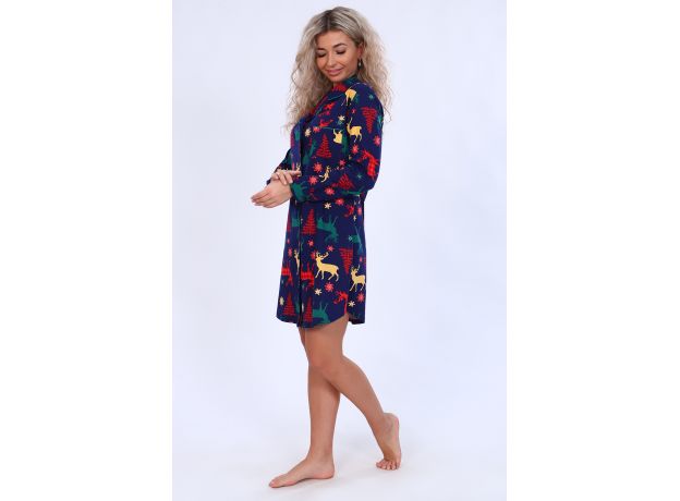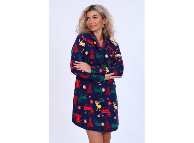 Женское платье-рубашка на пуговицах чуть выше колена с длинным рукавом на манжете. Разрез рукава окантован. На груди с левой стороны накладной карман с отделкой из канта. Воротник фигурный, рубашечного типа, обработан кантом. Низ рубашки закруглен и образует небольшие разрезы по бокам. Модель выполнена из высококачественного 100% хлопка, на ощупь ткань напоминает фланель, что создает комфорт и уют при носке. Модный дизайн модели и принту по ткани в виде оленей. Можно носить дома как халат-рубашку или на улице как платье-тунику. Подойдет на любую фигуру, скроет недостатки. Отлично смотрится на беременных. Широкий размерный ряд с 42 по 56. Отличный подарок любимым на праздник и по любому поводу!