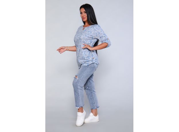 Женская блуза - туника с рукавом 3/4 с фигурным вырезом с окантовкой из основной ткани. Длина рукава регулируется патой на пуговице. Такая же регулировка находится по бокам изделия. Можно носить как с опущенной патой, так и собранной на декоративную пуговицу. Низ изделия закруглен, перед немного укорочен. Блузка отлично подойдет как для уличного, так и домашнего ношения. Прекрасно сочетается с джинсами на прогулку, с юбками - миди в офис, с домашними брюками для дома и дачи. Большой ассортимент приятных расцветок на любой вкус. Туника прекрасно смотрится на беременных, так как выполнена в свободном стиле. Отличный подарок любимым женщинам!
