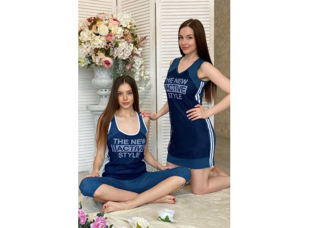 Туника-майка в спортивном стиле, полуприлегающего силуэта средней длины, с V-образной горловиной, без рукавов. Полочка с симметричными кокетками в верхней части. Средняя часть полочки выполнена из сетки. Вдоль боковых швов расположены вставки с лампасами из отделочного полотна. Горловина и проймы обработаны бейкой из основного полотна.